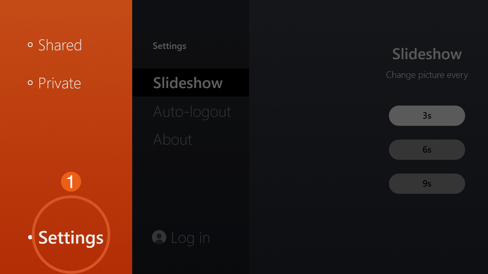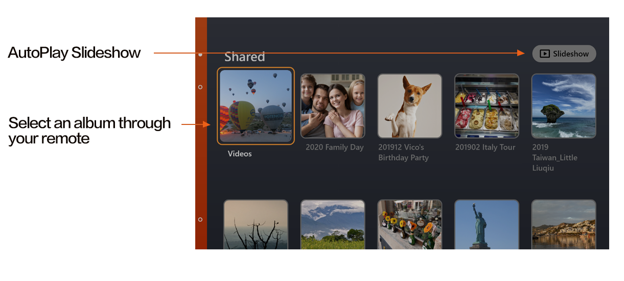 Click "Slideshow" on home page. Slideshow will start playing from the first photos in the first photo within the top album and continue in descending order all the way to the last album.